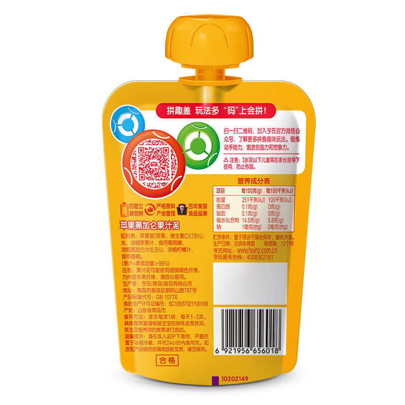 亨氏(Heinz)果汁泥 嬰兒水果泥寶寶輔食泥零食(1-3歲適用) 黑加侖蘋果120g