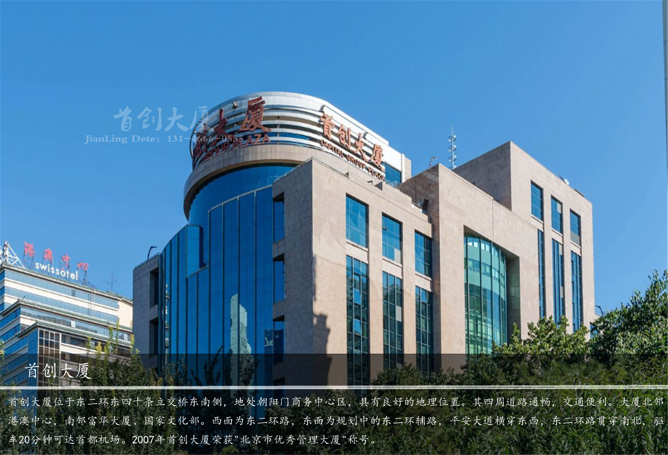 首創(chuàng)大廈位于北京市東城區(qū)朝陽門北大街6號(東二環(huán)東四十條立交橋東南側(cè)),地處朝陽門商務中心區(qū),具有良好的地理位置。其四周道路通暢,交通便利。大廈北鄰港澳中心,南鄰富華大廈、國家文化部。西面為東二環(huán)路,東面為規(guī)劃中的東二環(huán)輔路,平安大道橫穿東西,東二環(huán)路貫穿南北,驅(qū)車20分鐘可達首都機場。北側(cè)即為地鐵東四十條站,公交線路多達數(shù)十條,為客戶的出行提供了便利條件。與其周邊的藍島商圈、賽特商圈、東四商圈、CBD共同形成了北京目前成熟的高檔商務區(qū)。2007年首創(chuàng)大廈榮獲"北京市優(yōu)秀管理大廈"稱號。