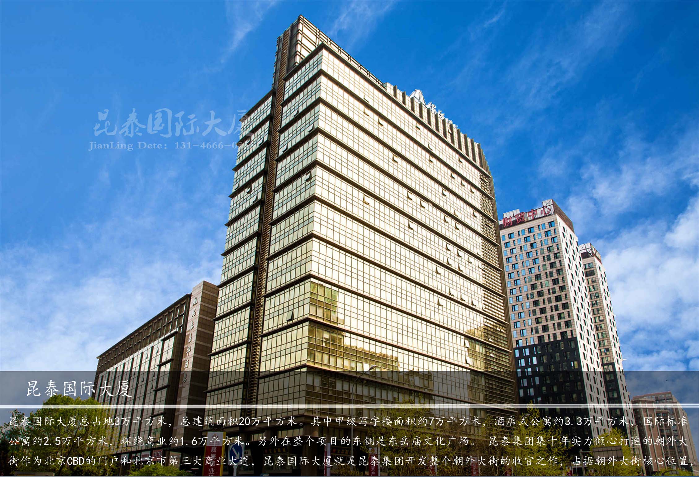 昆泰國際大廈項目總占地3萬平方米,總建筑面積20萬平方米。其中甲級寫字樓面積約7萬平方術(shù),酒店式公寓約3.3萬平方米,國際標準公寓約2.5萬平方米,環(huán)繞商業(yè)約1.6萬平方米。另外在整個項目的東側(cè)是東岳廟文化廣場。 昆泰集團集十年實力傾心打造的朝外大街作為北京CBD的門戶和北京市第三大商業(yè)大道,昆泰國際大廈就是昆泰集團開發(fā)整個朝外大街的收官之作,占據(jù)朝外大街核心位置,是集國際標準化公寓、酒店式公寓、甲級寫字樓和環(huán)繞式商業(yè)街為一體的大型綜合建筑體。位置顯赫、設(shè)施完善的集大成者。