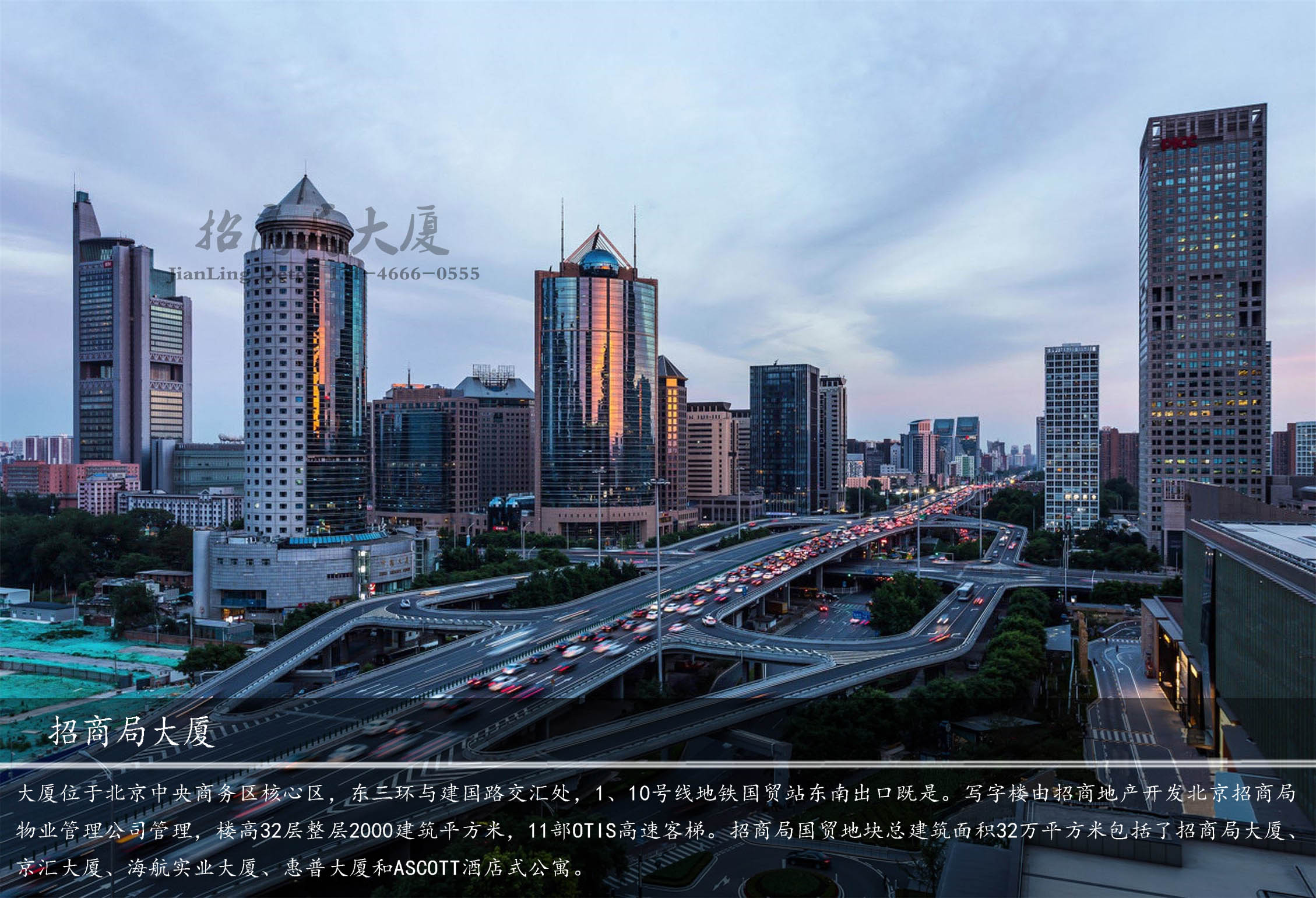 大廈位于北京中央商務(wù)區(qū)核心區(qū),東三環(huán)與建國路交匯處,1、10號線地鐵國貿(mào)站東南出口既是。寫字樓由招商地產(chǎn)開發(fā)北京招商局物業(yè)管理公司管理,樓高32層整層2000建筑平方米,11部OTIS高速客梯。招商局國貿(mào)地塊總建筑面積32萬平方米包括了招商局大廈、京匯大廈、海航實(shí)業(yè)大廈、惠普大廈和ASCOTT酒店式公寓。配套設(shè)有招商銀行、工商銀行、建設(shè)銀行、中信銀行、廣發(fā)銀行,潮福城、阿文上海菜、金鼎軒、阿一鮑魚以及星巴克咖啡廳、同仁堂。