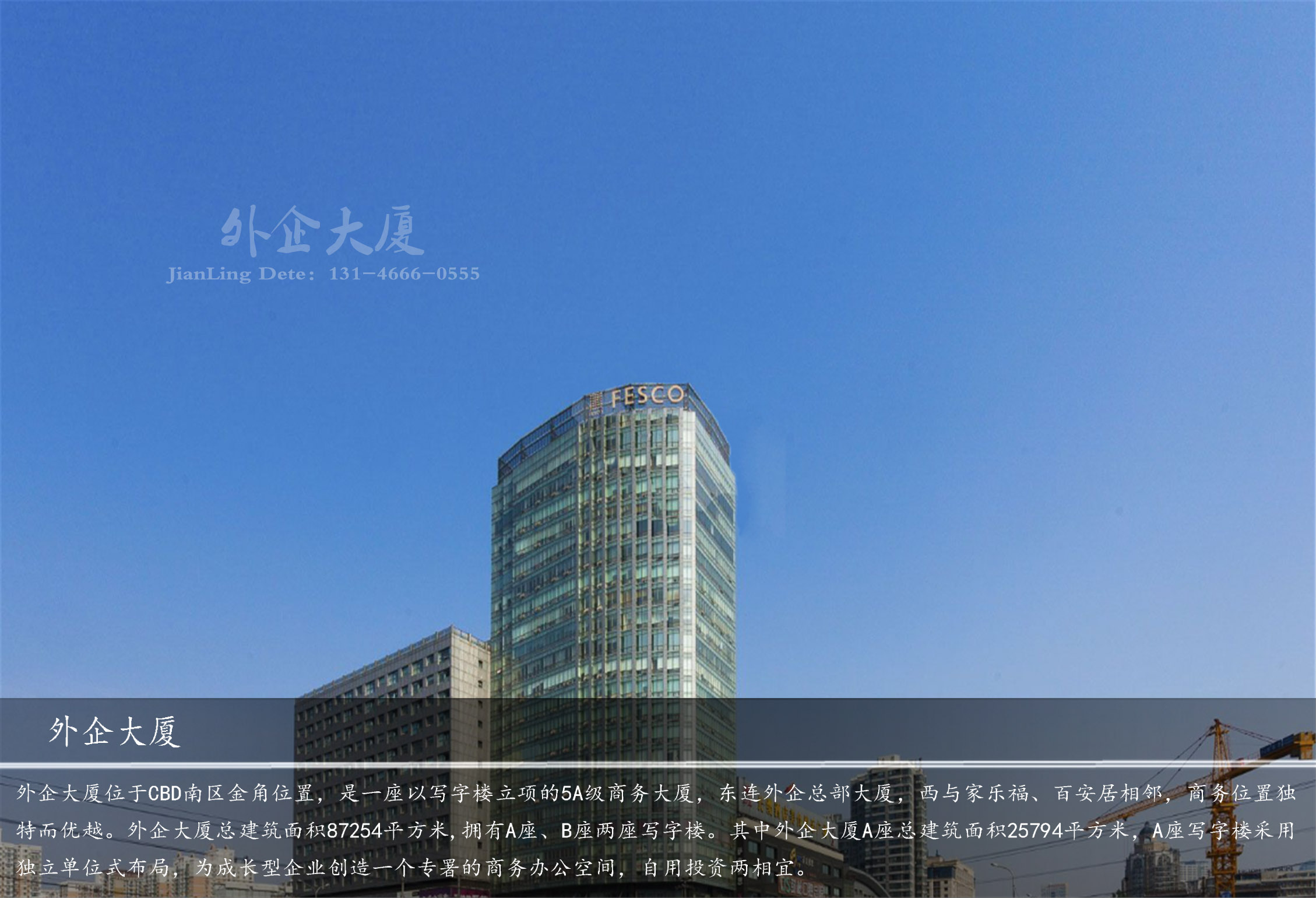外企大廈位于CBD南區(qū)金角位置,是一座以寫字樓立項的5A級商務(wù)大廈,東連外企總部大廈,西與家樂福、百安居相鄰,商務(wù)位置獨特而優(yōu)越。外企大廈總建筑面積87254平方米,擁有A座、B座兩座寫字樓。其中外企大廈A座總建筑面積25794平方米,A座寫字樓采用獨立單位式布局,為成長型企業(yè)創(chuàng)造一個專署的商務(wù)辦公空間,自用投資兩相宜。