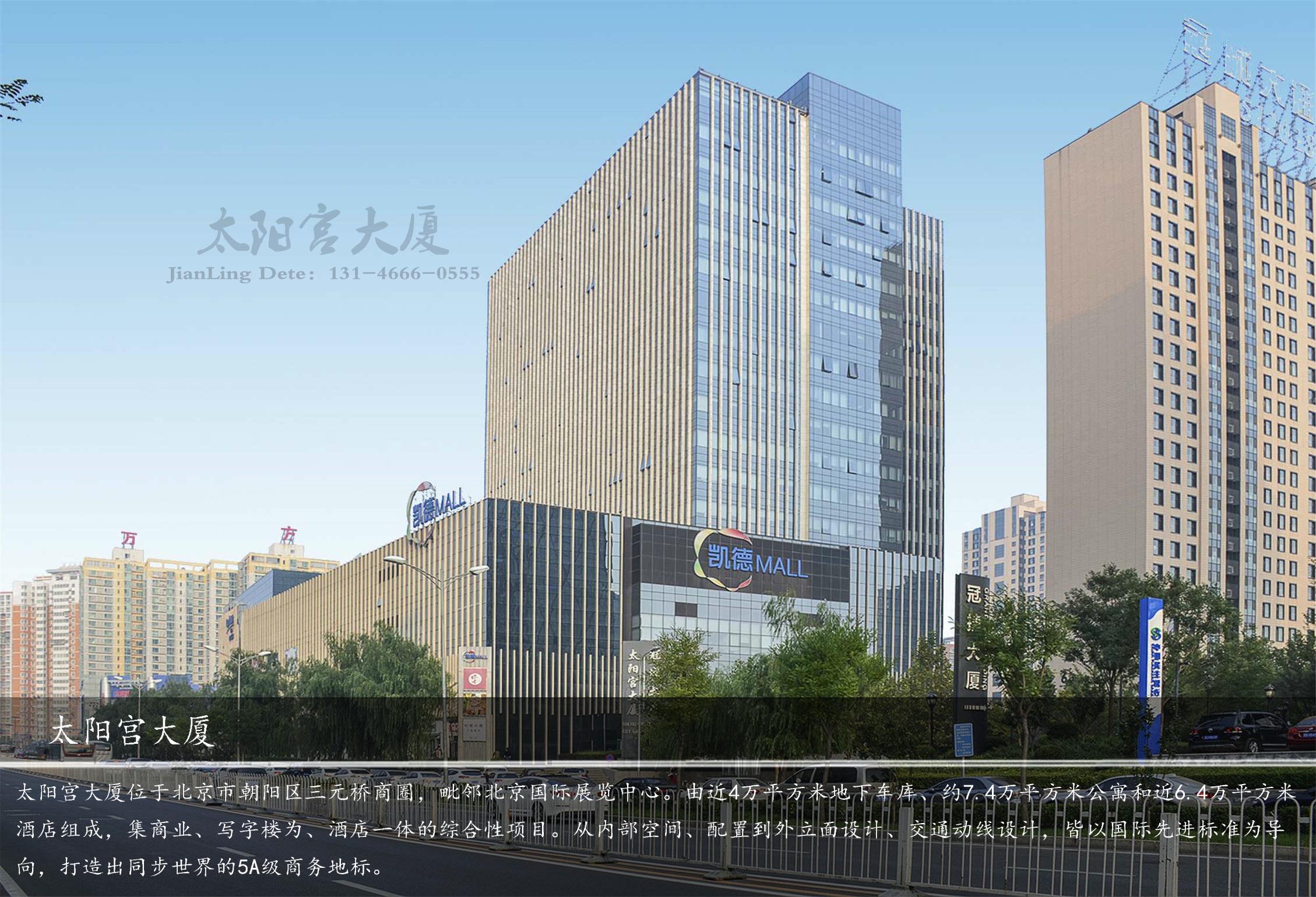 太陽宮大廈位于北京市朝陽區(qū)三元橋商圈,毗鄰北京國際展覽中心???,由、、近4萬平方米地下車庫、約7.4萬平方米公寓和近6.4萬平方米酒店組成,集商業(yè)、寫字樓為、酒店一體的綜合性項目。從內(nèi)部空間、配置到外立面設(shè)計、交通動線設(shè)計,皆以國際先進(jìn)標(biāo)準(zhǔn)為導(dǎo)向,打造出同步世界的5A級商務(wù)地標(biāo)。太陽宮大廈充分體現(xiàn)著"地鐵商務(wù)"的卓越價值。地鐵十號線太陽宮站直通寫字樓,通過地鐵出入口連接寫字樓與10號線太陽宮站。雙地鐵、機(jī)場第一高速、京順路、京承高速路在太陽宮大廈周邊,具有十分優(yōu)越的多維體立體交通路網(wǎng)。