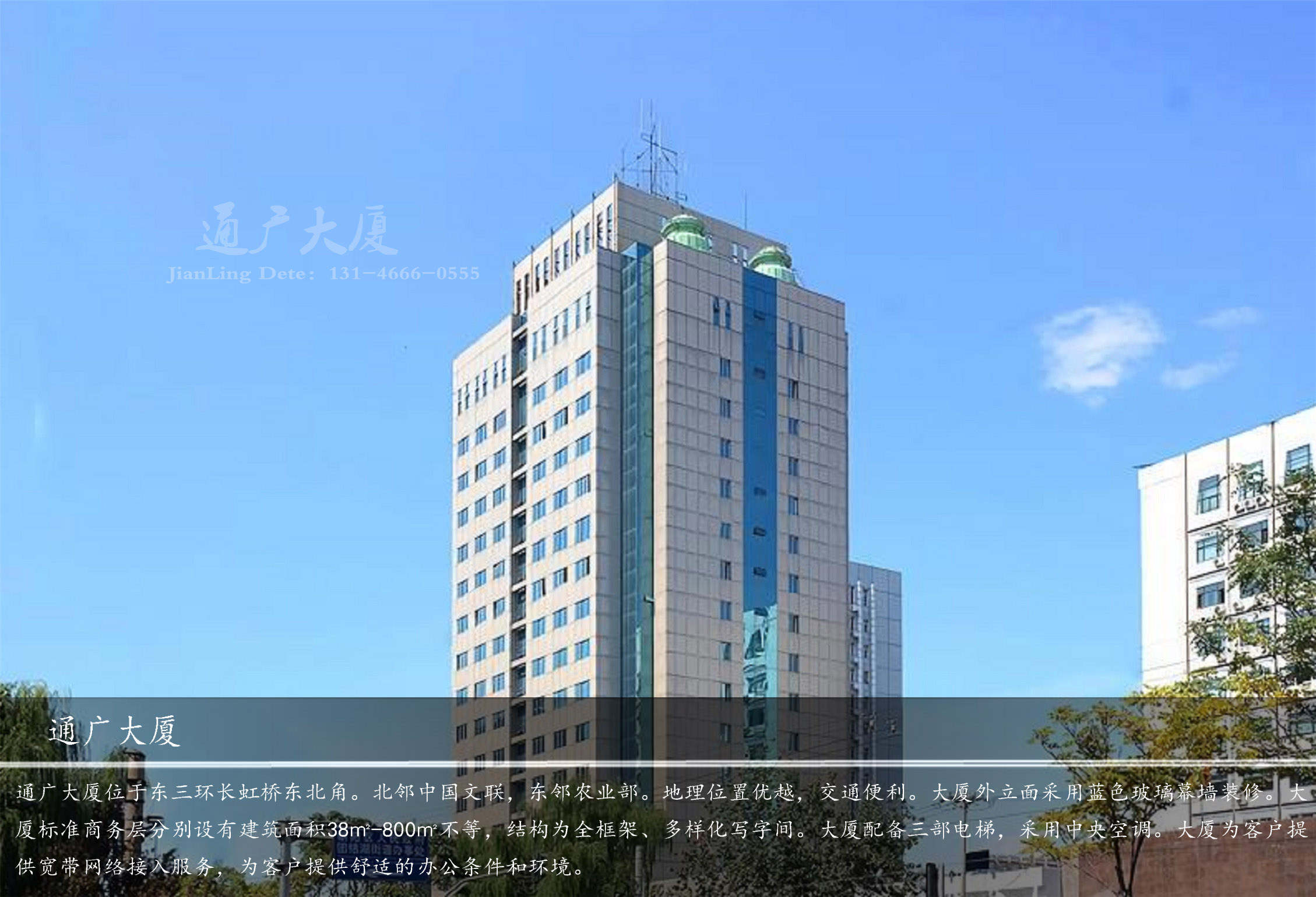 通廣大廈位于東三環(huán)長虹橋東北角。北鄰中國文聯(lián),東鄰農(nóng)業(yè)部。地理位置優(yōu)越,交通便利。大廈外立面采用藍色玻璃幕墻裝修。大廈標準商務層分別設有建筑面積38㎡-800㎡不等,結(jié)構(gòu)為全框架、多樣化寫字間。大廈配備三部電梯,采用中央空調(diào)。大廈為客戶提供寬帶網(wǎng)絡接入服務,為客戶提供舒適的辦公條件和環(huán)境。配有保安中央監(jiān)控系統(tǒng)、消防自動噴淋系統(tǒng),為您提供安全的工作保障。大廈備有車位100余個。大廈院內(nèi)設有招待所,為您和您的員工提供餐飲、住宿的服務
