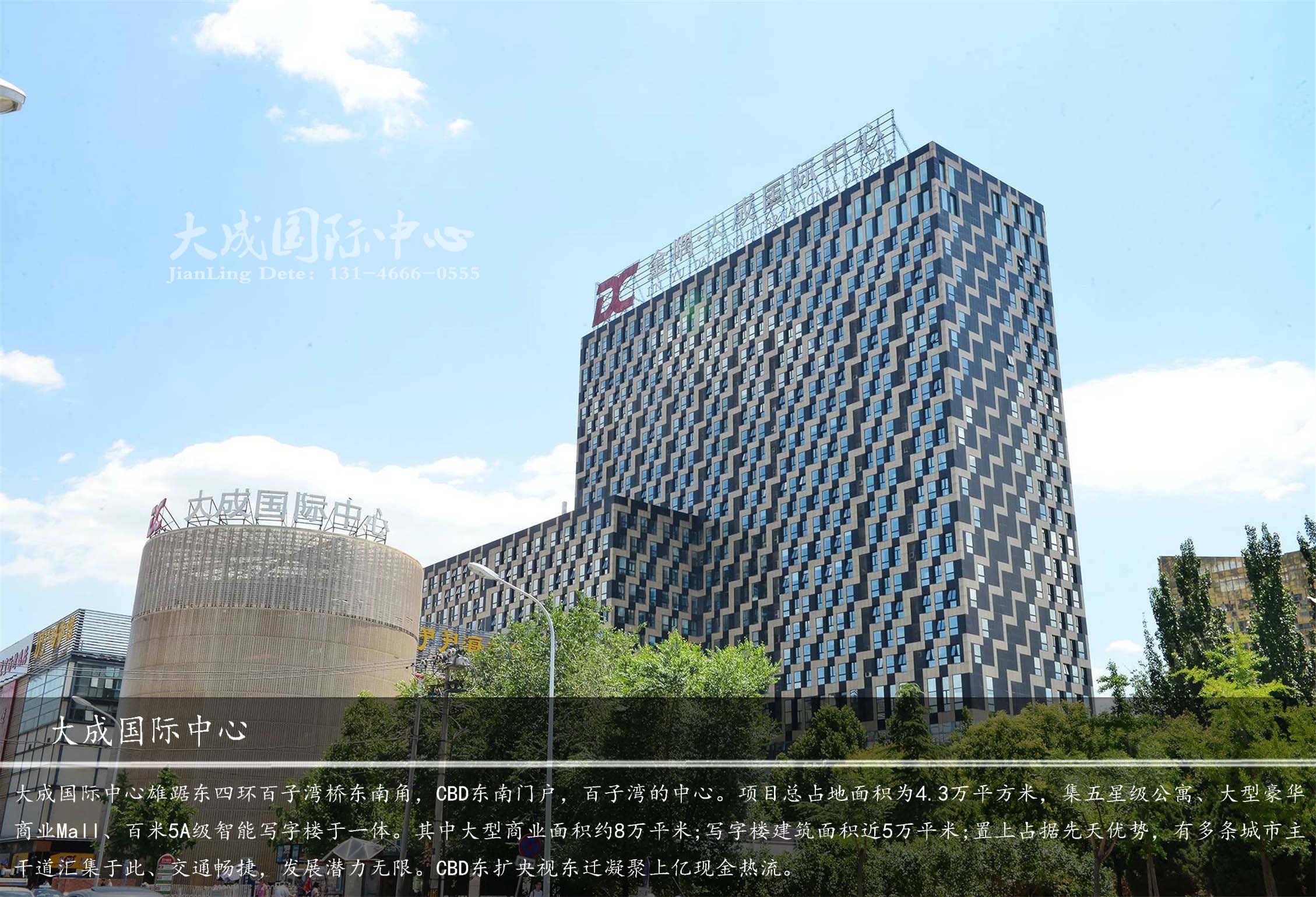CBD大舉東擴(kuò)成就上百萬高端消費(fèi)人流大成國(guó)際中心·世界與中國(guó)交匯的CBD財(cái)富焦點(diǎn)。大成國(guó)際中心,CBD中心區(qū)20萬平米建筑綜合體,雄踞東四環(huán)百子灣橋東南角,CBD東南門戶,百子灣的中心。項(xiàng)目總占地面積為4.3萬平方米,集五星級(jí)公寓、大型豪華商業(yè)Mall、百米5A級(jí)智能寫字樓于一體。其中大型豪華商業(yè)Mall面積約8萬平米;寫字樓建筑面積近5萬平米;國(guó)際公寓建筑面積為3.7萬平米。大成國(guó)際中心在位置上占據(jù)先天優(yōu)勢(shì),項(xiàng)目北距長(zhǎng)安街四惠橋地鐵站僅700米,步行只需12分鐘,西距國(guó)貿(mào)和北京電視臺(tái)僅一站地路程,南側(cè)100米是貫穿北京東西的廣渠路(即將升級(jí)為城市快速路),同時(shí)還有08年完工的西客站至通州的7號(hào)線大郊亭站,并有多條城市主干道匯集于此、交通暢捷,發(fā)展?jié)摿o限。CBD東擴(kuò)央視東遷凝聚上億現(xiàn)金熱流。
