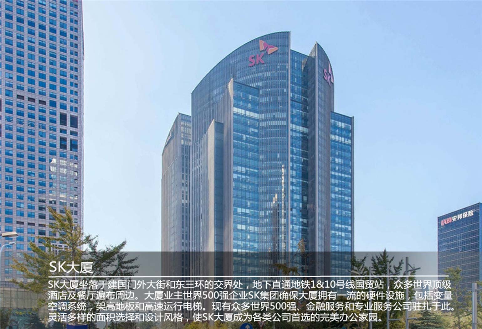 SK大廈坐落于建國門外大街和東三環(huán)的交界處,地下直通地鐵1&10號(hào)線國貿(mào)站,眾多世界酒店及餐廳遍布周邊。大廈業(yè)主世界500強(qiáng)企業(yè)SK集團(tuán)確保大廈擁有的硬件設(shè)施,包括變量空調(diào)系統(tǒng),架高地板和高速運(yùn)行電梯。現(xiàn)有眾多世界500強(qiáng)、金融服務(wù)和專業(yè)服務(wù)公司駐扎于此。靈活多樣的面積選擇和設(shè)計(jì)風(fēng)格,使SK大廈成為各類公司首選的完美辦公家園。周圍遍布國貿(mào)中心、銀泰中心、IFC大廈等多座甲級(jí)寫字樓。世界500強(qiáng)和跨國公司總部、國際金融機(jī)構(gòu)、咨詢公司等集中在該商務(wù)圈,是國際經(jīng)濟(jì)文化交流的中心。該商務(wù)圈以商務(wù)辦公為主,商務(wù)配套設(shè)施成熟完善,包括國貿(mào)商場和面向大眾消費(fèi)的建外SOHO商鋪街。