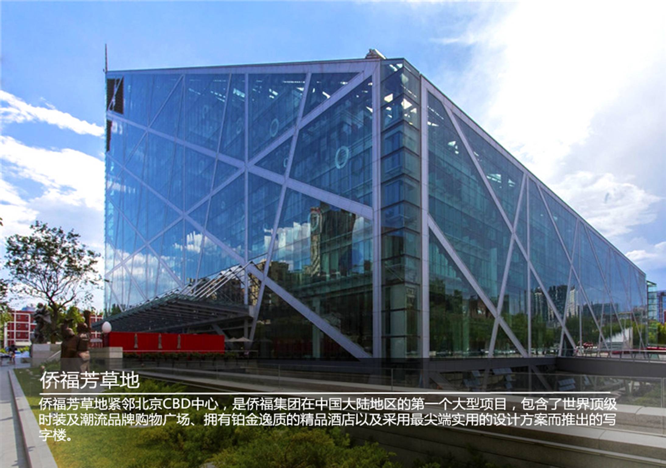 僑福芳草地緊鄰北京CBD中心,是僑福集團在中國大陸地區(qū)的第一個大型項目,包含了世界時裝及潮流品牌購物廣場、擁有鉑金逸質(zhì)的精品酒店以及采用實用的設(shè)計方案而推出的寫字樓。從細(xì)致入微的綠色科技應(yīng)用到美國LEED鉑金預(yù)先認(rèn)證的榮譽,僑福芳草地將環(huán)保與奢華完美結(jié)合,刷新了北京地標(biāo)的新理念,并帶來高端地產(chǎn)行業(yè)新一輪的綠色革命。