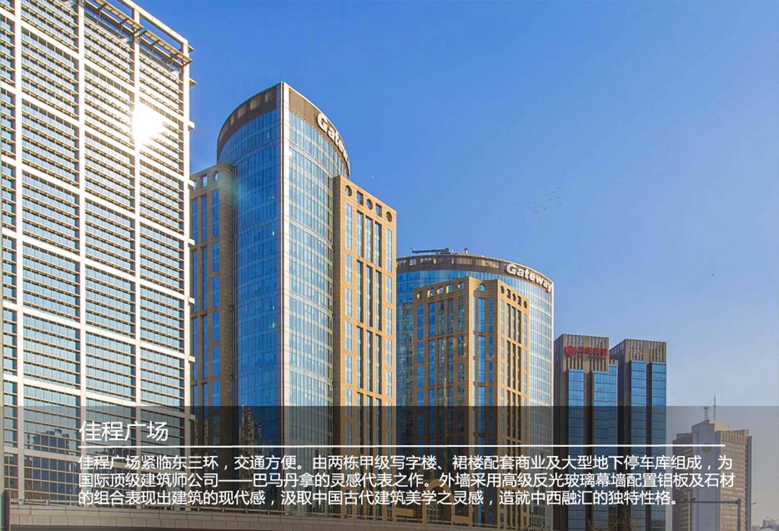 佳程廣場緊臨東三環(huán),交通方便。由兩棟甲級寫字樓、裙樓配套商業(yè)及大型地下停車庫組成,為國際建筑師公司——巴馬丹拿(P&TGROUP)的靈感代表之作。外墻采用高級反光玻璃幕墻配置鋁板及石材的組合表現(xiàn)出建筑的現(xiàn)代感,汲取中國古代建筑美學之靈感,造就中西融匯的獨特性格。