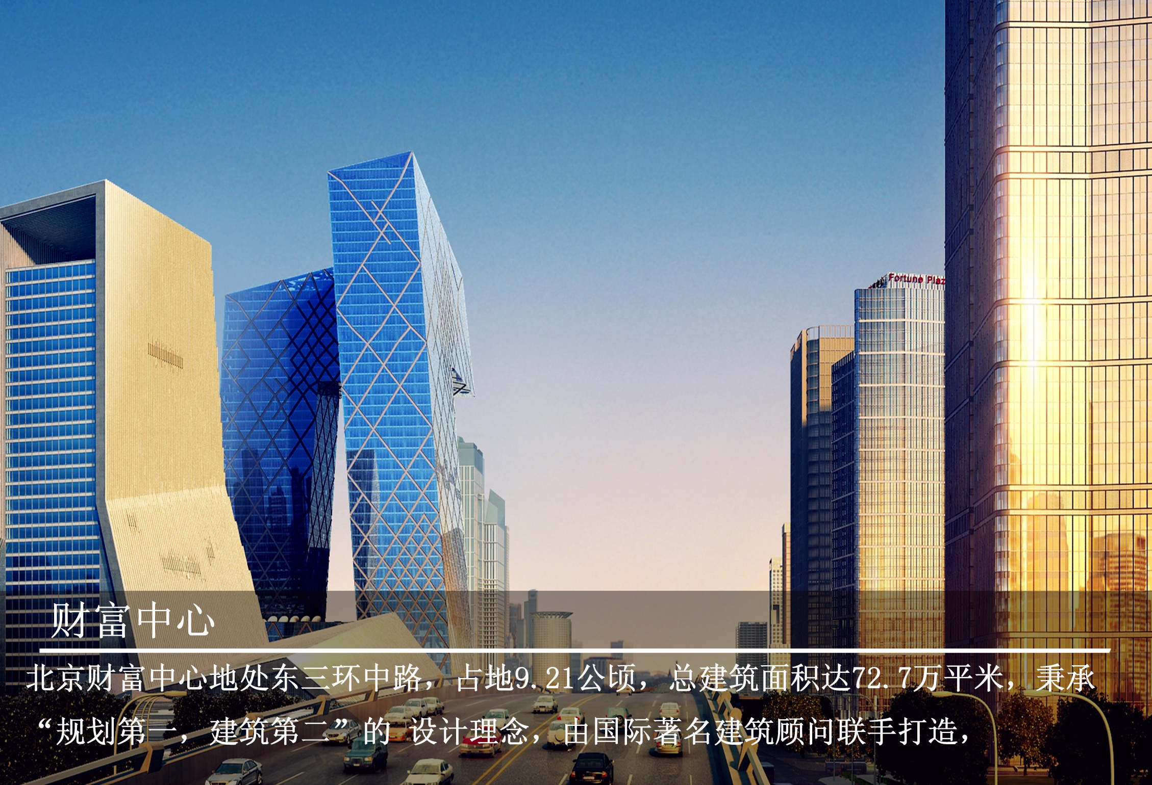 財富金融中心(FFC),扼守CBD商務(wù)核心地段,總建筑面積17.6平方米,建筑高度達(dá)265米,是目前北京較高的純寫字樓。項目緊鄰東三環(huán)中路、半小時內(nèi)科迅速抵達(dá)金融街、燕莎、中關(guān)村等商務(wù)區(qū),交通極其便利。作為73萬平方米北京財富中心綜合體的登頂之作,財富金融中心秉承了健康、環(huán)保、節(jié)能、的規(guī)劃理念,嚴(yán)格按照LEED金級標(biāo)準(zhǔn)規(guī)格建造,加上擁有CBD商務(wù)園林,配合先進(jìn)的空氣凈化系統(tǒng)、二氧化碳監(jiān)控系統(tǒng)、VAV空調(diào)系統(tǒng)及多項人性化設(shè)置如首層9米挑高香氛大堂、2600-2900平米無柱式單層平面,北京財富三期延續(xù)財富中心已建成物業(yè)設(shè)計風(fēng)格,采用全帷幕墻的矩型簡潔造型,橫向優(yōu)美的斜線和縱向凸起的垂直惟幕牆線條相協(xié)調(diào),與現(xiàn)有建筑群立面處理比例上互相呼應(yīng)。