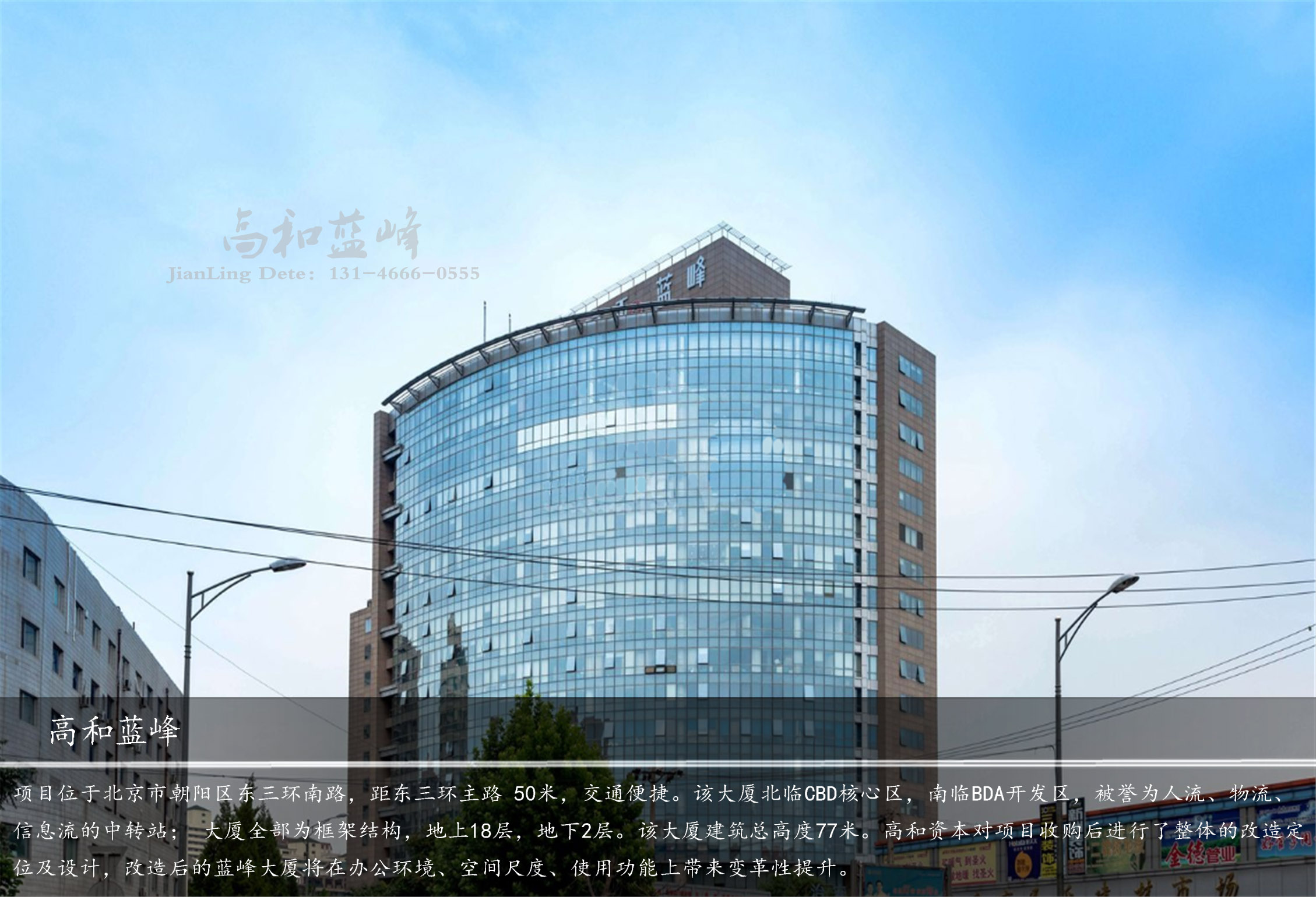 項(xiàng)目位于北京市朝陽區(qū)東三環(huán)南路,距東三環(huán)主路 50米、距國貿(mào)4800米、距京津塘高速1公里,交通便捷。該大廈北臨CBD核心區(qū),南臨BDA開發(fā)區(qū),被譽(yù)為人流、物流、信息流的中轉(zhuǎn)站; 大廈全部為框架結(jié)構(gòu),地上18層,地下2層。該大廈建筑總高度77米。主樓目前為寫字樓,配樓目前為酒店東三環(huán)可租可售精品甲級(jí)寫字樓極高的項(xiàng)目品質(zhì),高檔的配套設(shè)施綠色,健康的辦公空間絢麗樓身,璀璨地標(biāo)。高和資本對(duì)項(xiàng)目收購后進(jìn)行了整體的改造定位及設(shè)計(jì),改造后的藍(lán)峰大廈將在辦公環(huán)境、空間尺度、使用功能上帶來變革性提升,尤其是增加了智能治理PM2.5的凈化設(shè)備。高和藍(lán)峰大廈將成為高和資本定義未來生態(tài)辦公產(chǎn)品的標(biāo)桿杰作。
