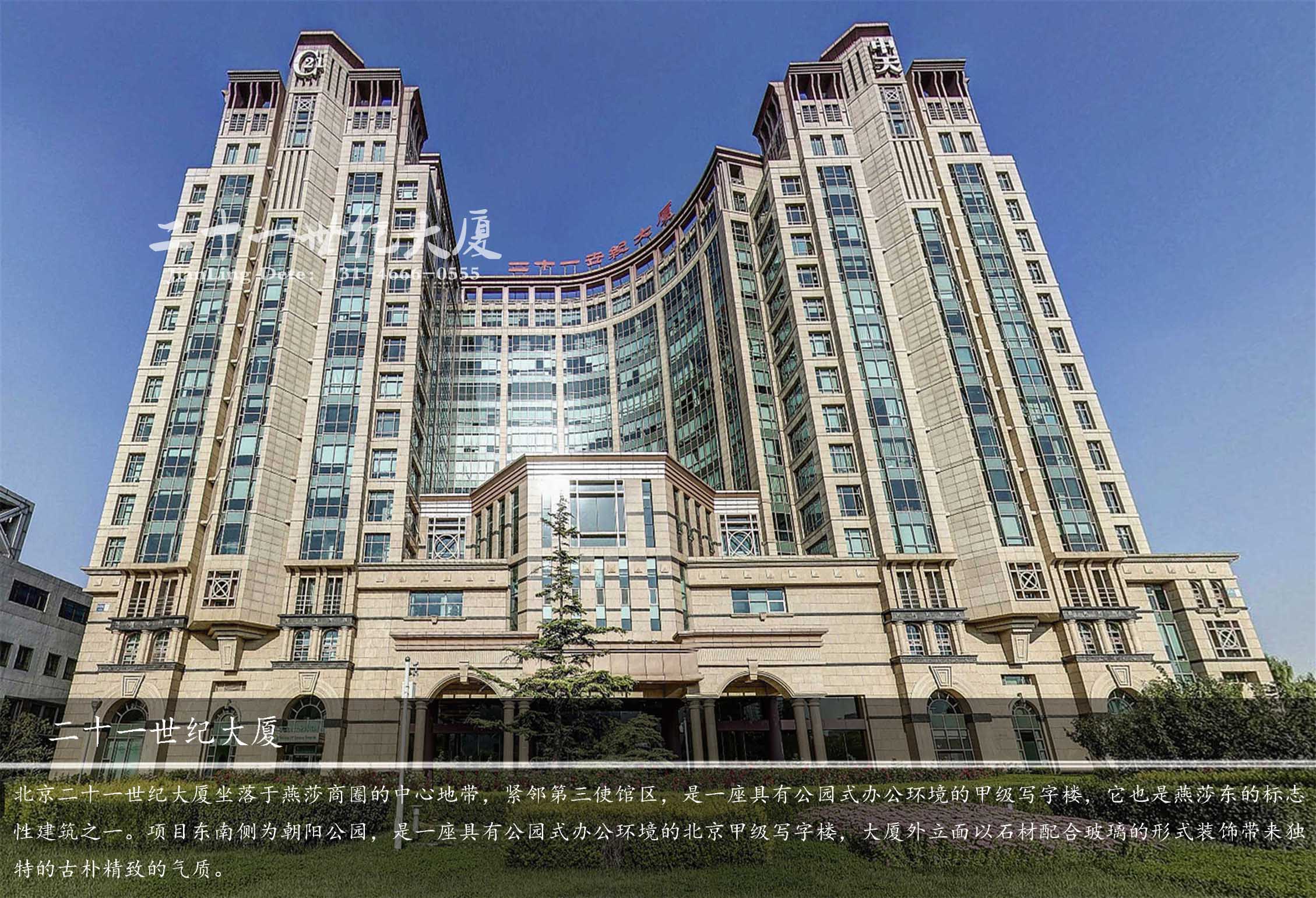 北京二十一世紀(jì)大廈坐落于北京朝陽區(qū)亮馬橋路甲40號,屬于燕莎商圈的中心地帶,緊鄰第三使館區(qū),是一座具有公園式辦公環(huán)境的北京甲級寫字樓,它也是燕莎東的標(biāo)志性建筑之一。項(xiàng)目東南側(cè)為朝陽公園,是一座具有公園式辦公環(huán)境的北京甲級寫字樓。二十一世紀(jì)大廈以石材配合玻璃的形式裝飾外立面,帶來獨(dú)特的古樸精致的氣質(zhì),較強(qiáng)的感官印象將成為本項(xiàng)目的一張“名片”,達(dá)到提升關(guān)注程度的良性作用。大廈門前有10多條公交線路,交通頗為便利。